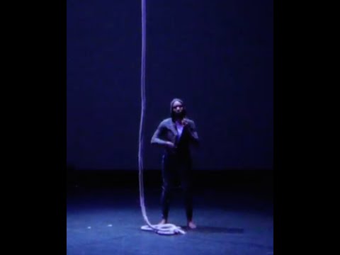 “In Movement Posed Afresh, aerialist Kiebpoli Calnek performs on corde lisse, a circus skill that involves acrobatics on a single vertically hanging rope, without a net. Her costume was made in relation to the colors known of Calder, and an ambient drone soundtrack of helicopters swooping far and near fills the voluminous space.”